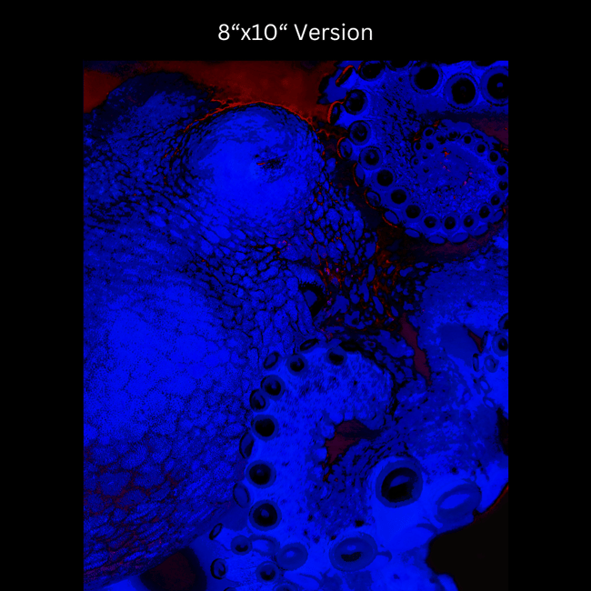 A ruby octopus photo edited so that the octopus is in blue tones with dramatic red lighting. To me it is very evocative of a dramatic superhero comic in which the octopus is the brooding hero or newly revealed villain.