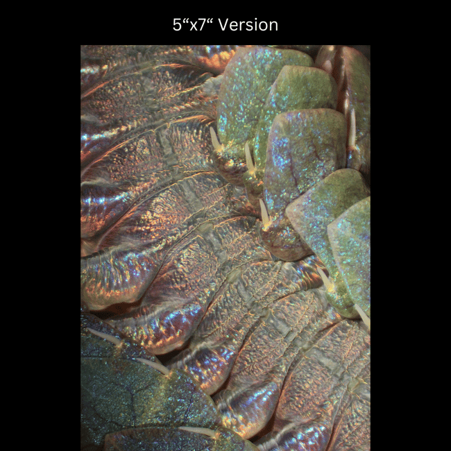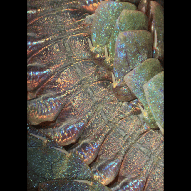 A closeup photo of the holographic skin of a nereid worm. These worms spend most of their life in the sand until they are ready to spawn. They then undergo a transformation into this swimming form called an epitoke. This one was seen in the Salish Sea during Summer 2022.