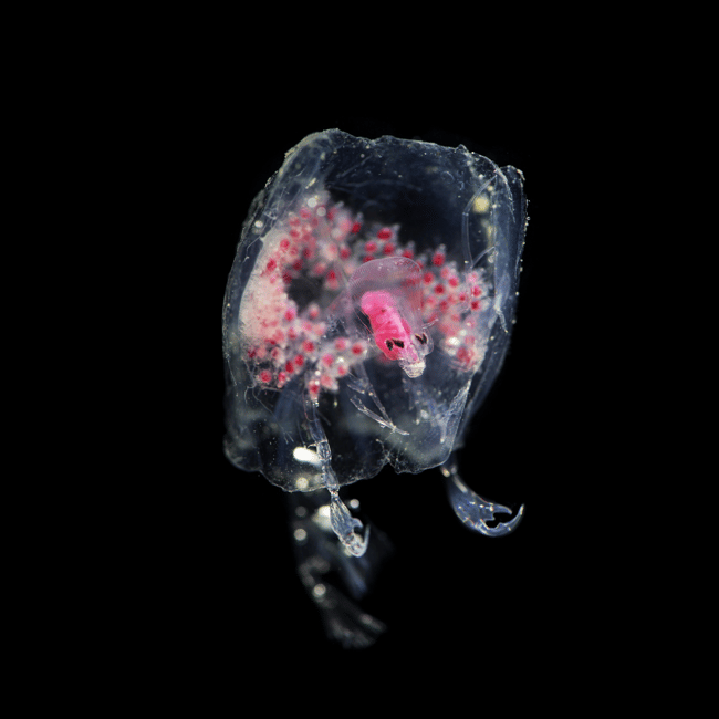 This Phronima mom and it's little pink babies came into the lab transparent but soon after ate a Beroe abyssicola and turned hot pink.