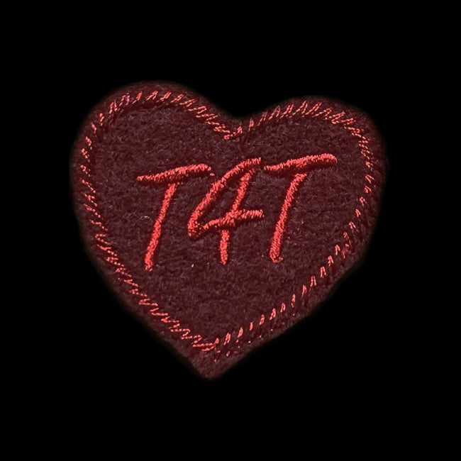 Image ID: An array of the patch options on a black background. The red felt heart patches have a stem stitch border and embroidered kind of swoopy text. Subsequent images are close ups of each option.