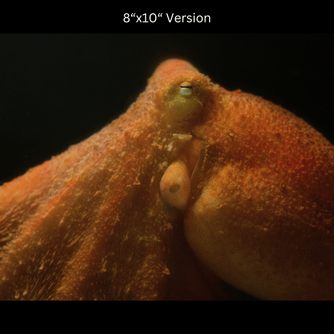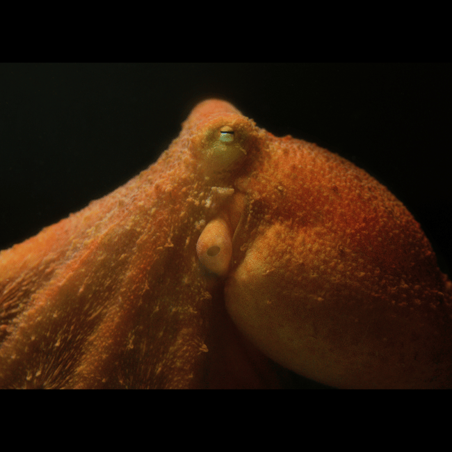 Closeup portrait of a red octopus with a dark background. This animal was being cared for by researchers at Rosario Beach Marine Lab, who graciously let me photograph it.